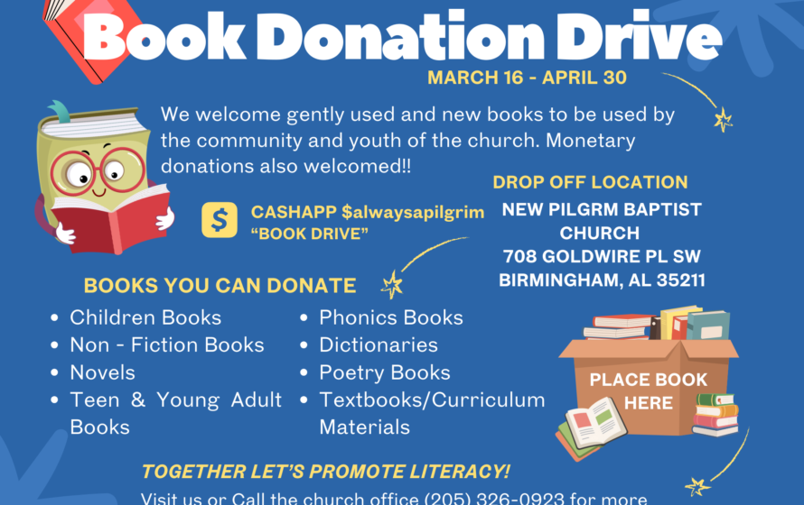 Our book drive has now started. There are bins at the main entrances where you can place your donated books. Whether they are old or new, children or teen, fiction or nonfiction they all are welcome. If you would like, you may also give monetary donations as well. Our cashapp is $Alwaysapilgrim and you can include in the memo book drive.