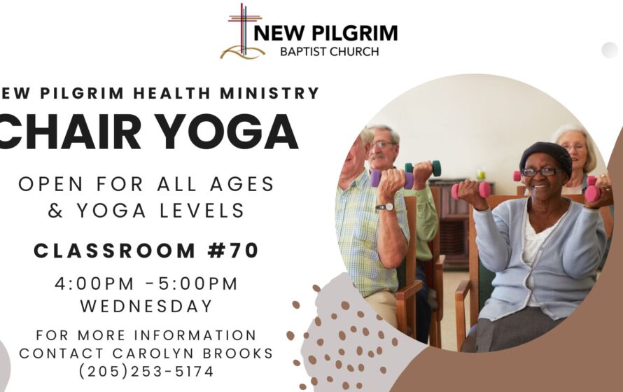 New Pilgrim Health Ministry, join us in chair yoga, open for all ages and yoga levels. We will be located in classroom #70 from 4PM to 5PM on Wednesdays. For more information, call Carolyn Brooks at 205-253-5174.