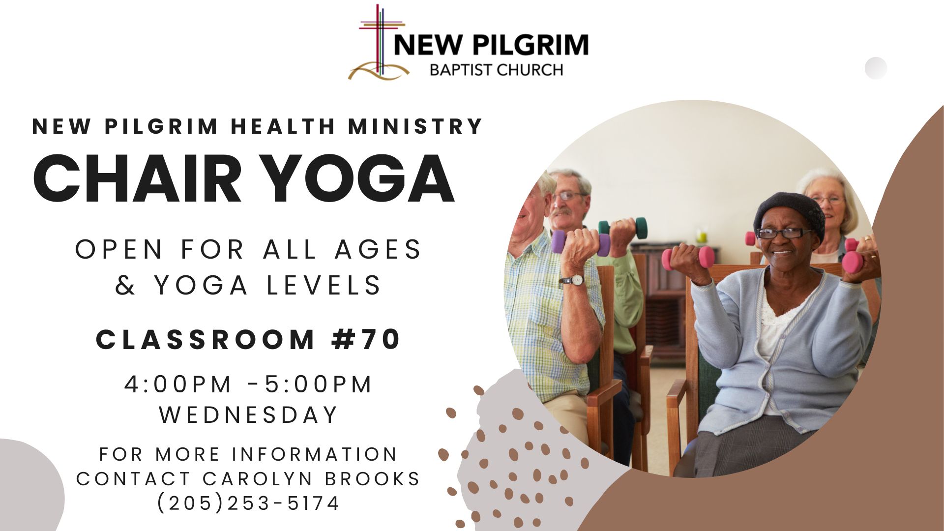 New Pilgrim Health Ministry, join us in chair yoga, open for all ages and yoga levels. We will be located in classroom #70 from 4PM to 5PM on Wednesdays. For more information, call Carolyn Brooks at 205-253-5174. |