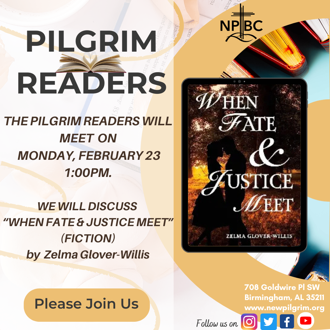 The pilgrim reader's next meeting will be Monday, February 23rd at 1pm. They will be discussing the book, When Fate and Justice Meet. The author, Zelma Glover-Willis will be joining them for a chat. |